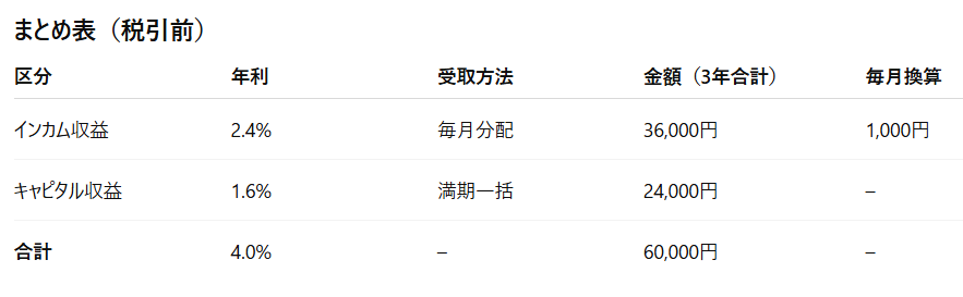 仮に50万円預けると、毎月約1,000円(税引き前)が3年間もらえ続けるよ!