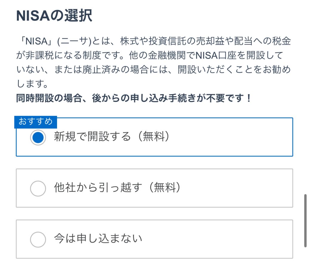 「NISAを申し込む」→「新規で開設する」にチェックを入れる。