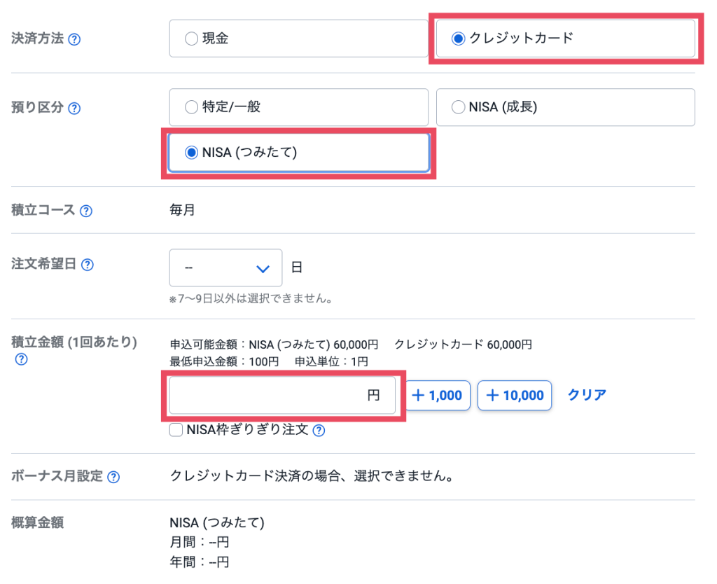 「クレジットカード」➡「NISA(つみたて投資枠)」➡「積立金額」の順に入力。