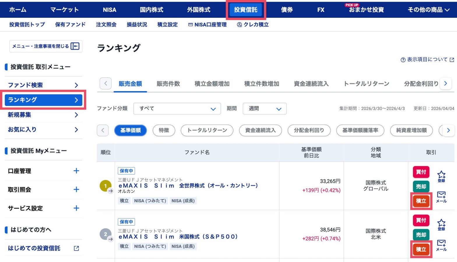 「投資信託」➡「ランキング」➡積み立てたい銘柄をタップ。